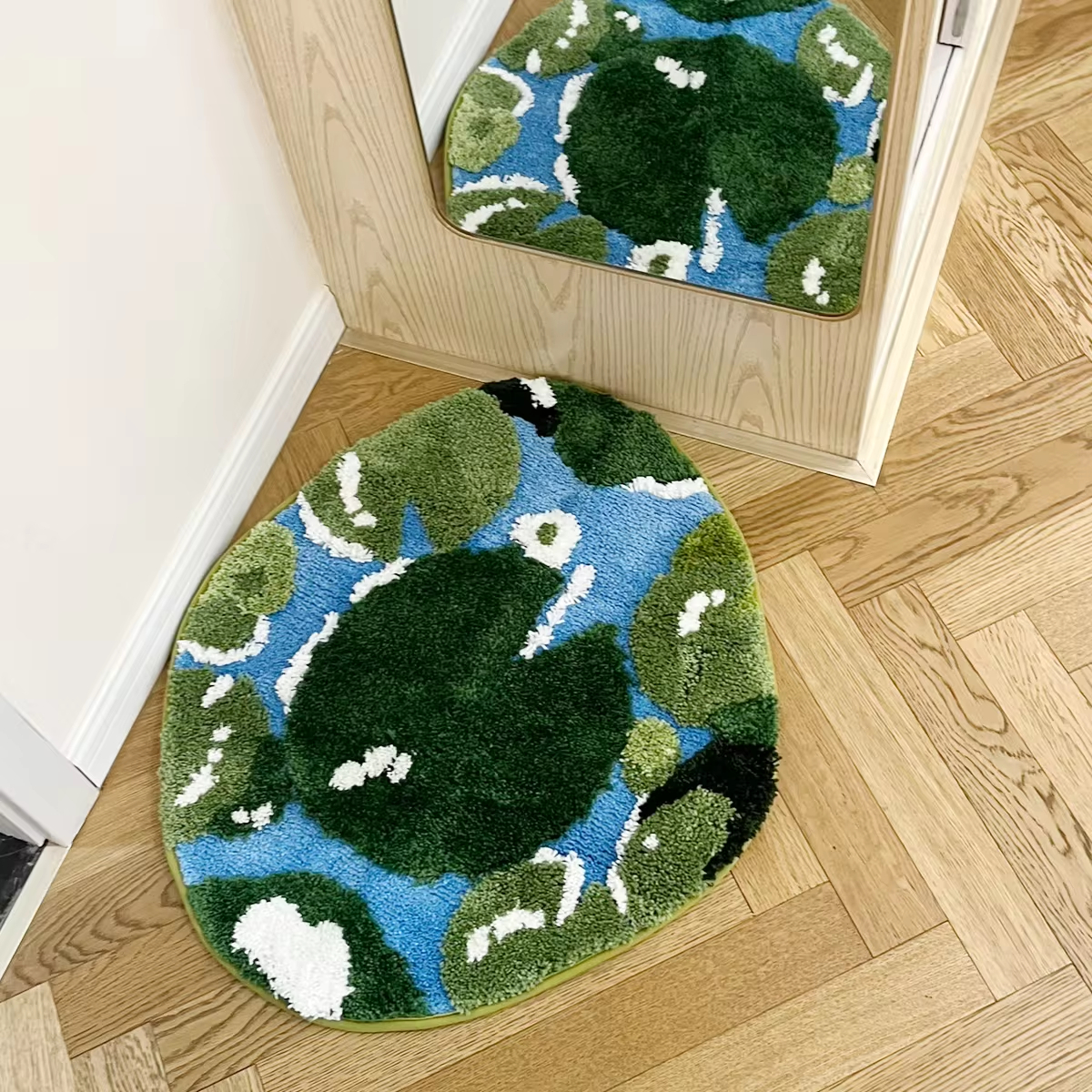 Oval Lotus Leaf Pattern Fluffy Rug - Green & Blue Water Landscape Plush Carpet, Soft Non-Slip Washable Floor Mat, Fresh Nature Style Home Decor for Bedroom, Living Room, Kids Room, Entryway Cluster Rug