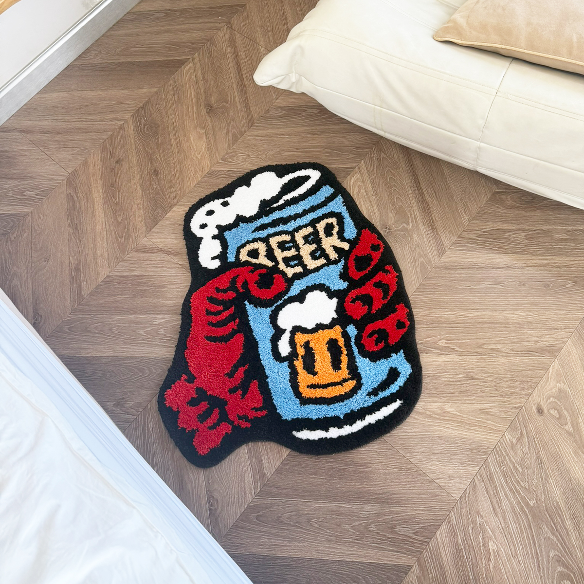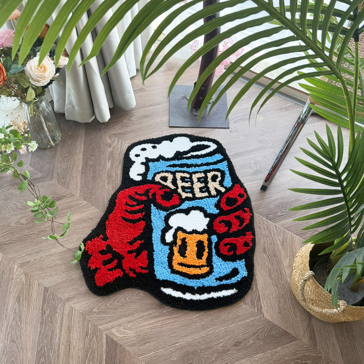 Retro Beer & Claws Tufted Rug - Funky Cartoon Style Anti-Slip Floor Mat for Home Bar & Living Room Decor.